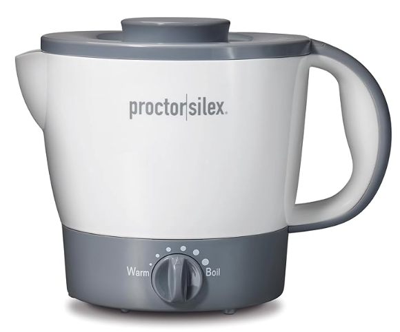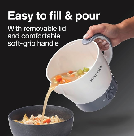 The Proctor Silex Electric Kettle holds 0.95 quarts (32 ounces), heating quickly for tea, coffee, or oatmeal. It also cooks/reheats noodles, canned soups, and leftovers. You can adjust heat (warm to boil) via the dial. The PAS-free nonstick interior and removable lid make cleanup simple (rinse/wipe). Its removable lid eases filling, and the soft handle ensures a comfortable grip when pouring.