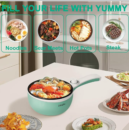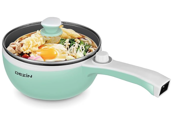The DEZIN Electric Cooking Pot works without a stove—you can use it to sauté steak, fry rice, cook noodles, boil eggs, etc., and it comes with a silicone turner spatula. It has dual power options (250W/600W) to adjust heating for different foods, plus overheating and boil-dry protection for safety. With a 1.5-quart capacity (including the lid), it’s compact enough for dorms, small apartments, or picnics. Its nonstick coating reduces oil usage and prevents food from sticking, making cleanup simple.