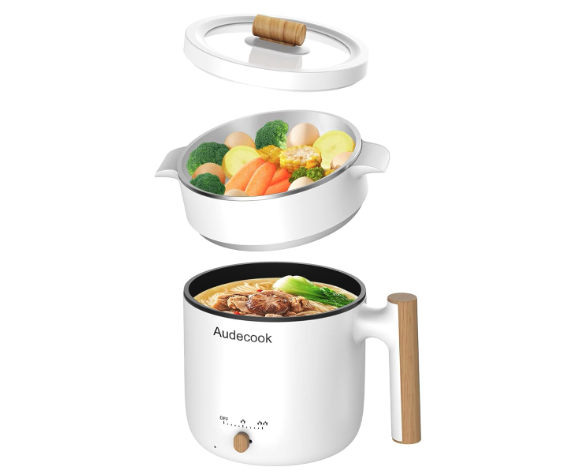 The Audecook Mini Hot Pot is designed for small servings (singles, couples, small families) and fits in dorms, offices, or RVs. It uses 360° round embedded heating technology to heat food faster and more evenly than ordinary pots. It has dual power (250W/600W): 250W for oatmeal/eggs, 600W for searing/steaming. It includes a stainless steel steamer plate (cook soup and sides at once) and a heat-resistant glass lid (with steam vent for visibility). The nonstick interior and ergonomic wooden handle add convenience. But it has a small issue. If the food is relatively heavy, the handle design makes it inconvenient to lift, as it cannot be carried with both hands.
