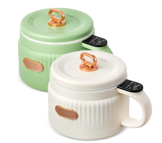 This 2-piece set (mint green/cream yellow) has an elegant design, suitable for home, dorm, or outdoor meal heating. It’s multifunctional—make oatmeal, pasta, dumplings, soup, etc.—and prepares quick meals for busy schedules. The 600W full-circle heating plate cooks evenly, and boil-dry protection avoids uneven cooking. With a 1.6-quart capacity (≈9.8×6.7 inches), it’s easy to store in small spaces. Its ceramic nonstick coating reduces oil usage and simplifies cleanup (wipe/rinse only). However, it lacks enough customer reviews.