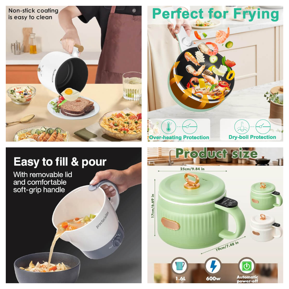 Key Specs: 0.95L capacity (single serving), adjustable heat (warm–boil), 1.75 lbs, 6.5"L × 9"W × 6.7"H, PFAS-free non-stick coating